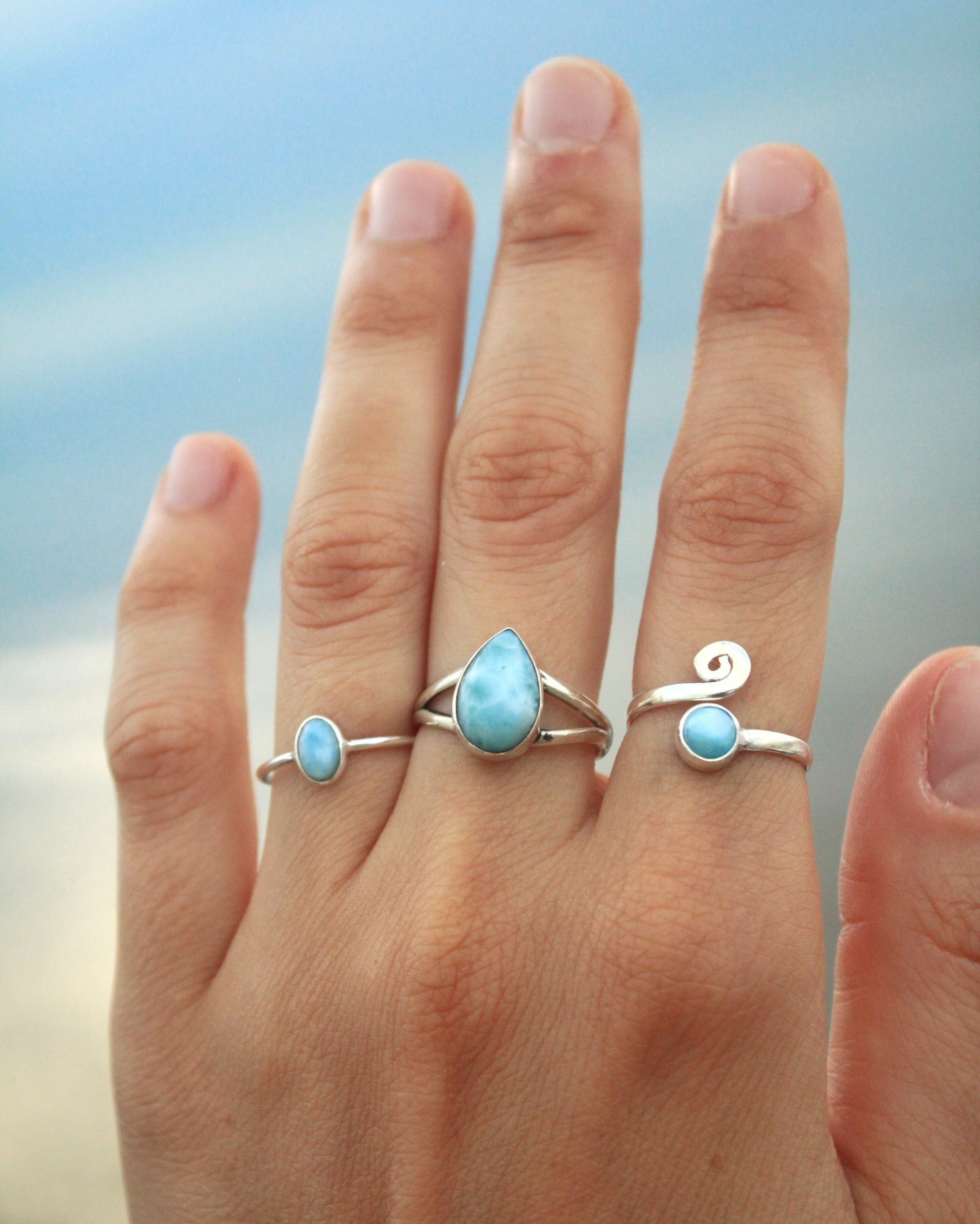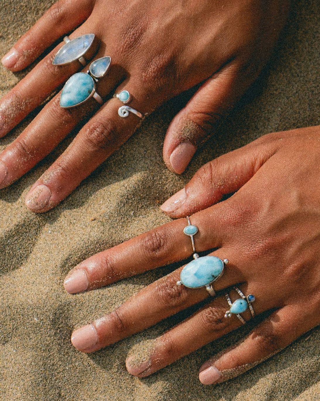 Realizzato a mano in argento e impreziosito dal Larimar, porta con sé l’energia calma del mare all’alba. Il larimar, con le sue sfumature che ricordano l'acqua cristallina, invita alla quiete e alla guarigione emotiva.