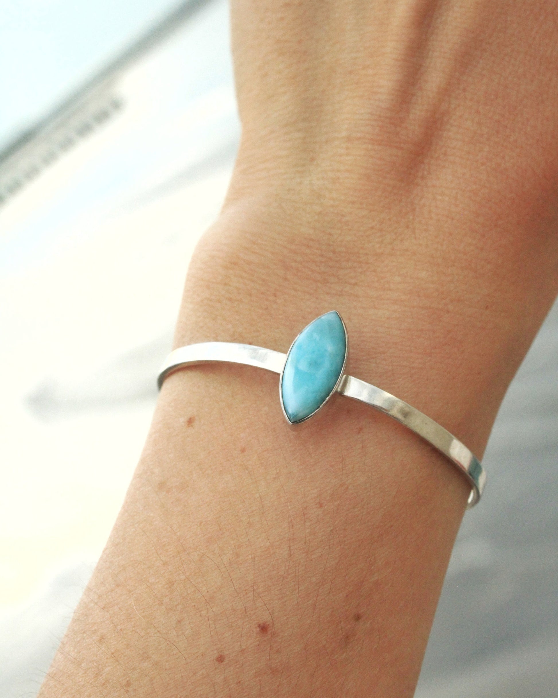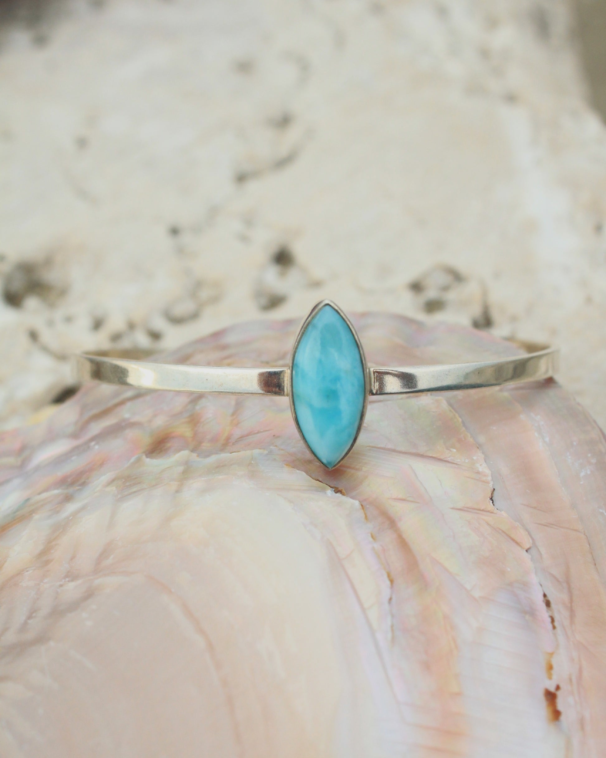 Realizzato a mano in argento e impreziosito dal Larimar, porta con sé l’energia calma del mare all’alba. Il Larimar, con le sue sfumature che ricordano l'acqua cristallina, invita alla quiete e alla guarigione emotiva.