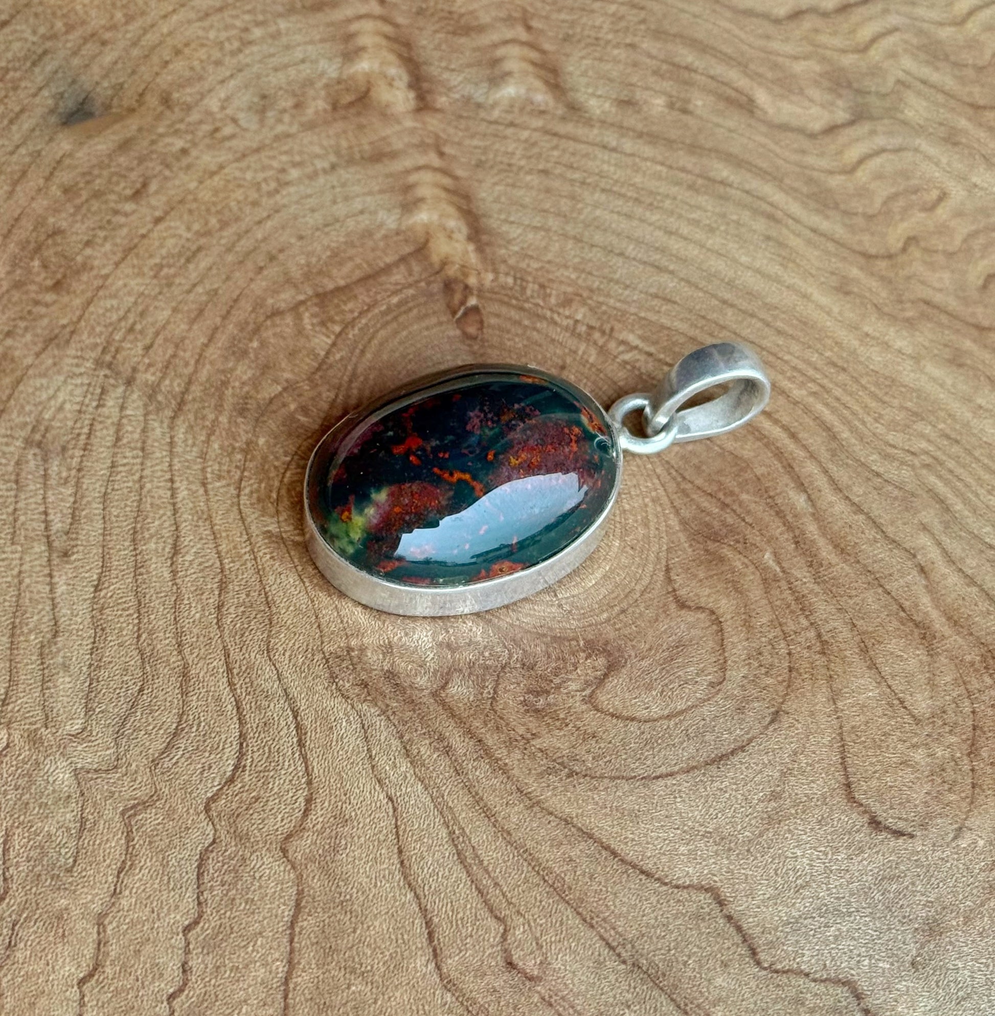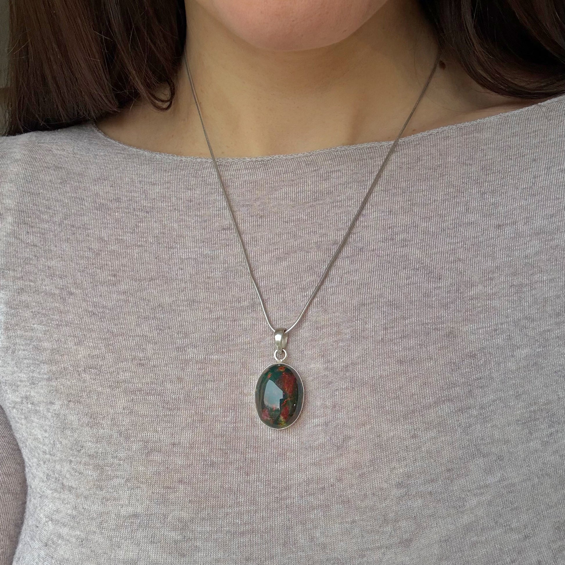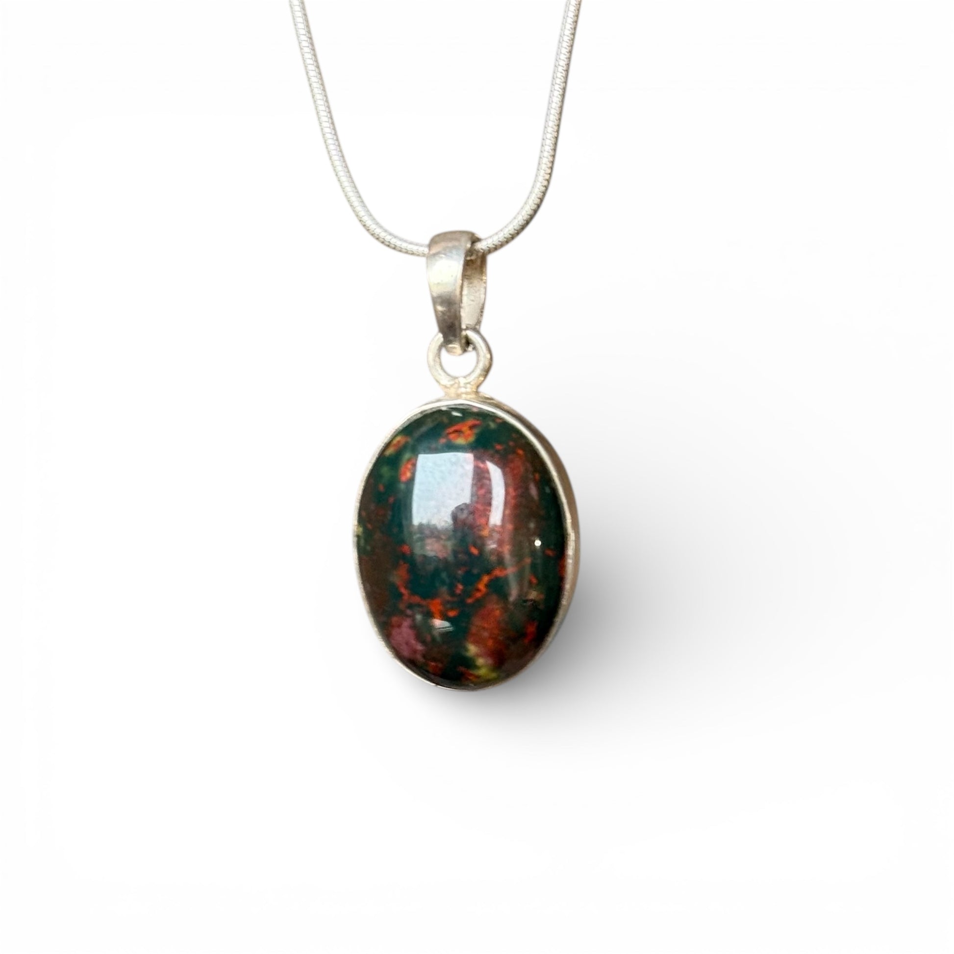 Il Ciondolo in Eliotropio, conosciuto anche come pietra del sangue, è un antico simbolo di forza vitale, protezione e coraggio interiore. Fin dall’antichità, l’eliotropio è stato associato al radicamento profondo e alla capacità di rimanere centrati anche nei momenti di trasformazione e sfida.