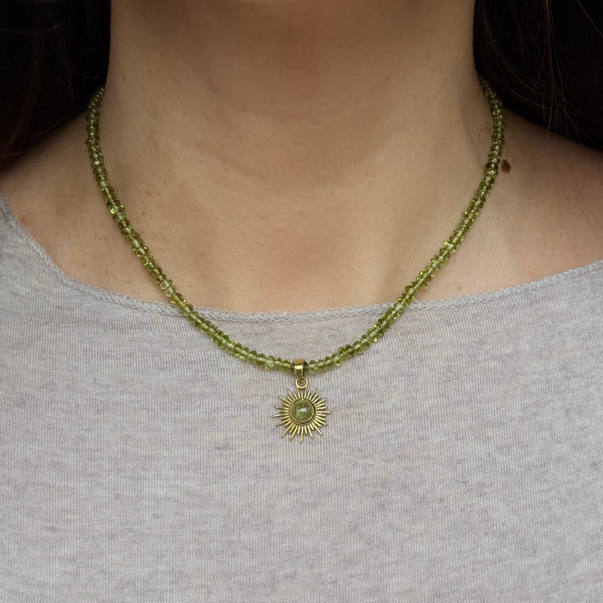 La Collana Sole con Peridoto Verde celebra la luce, la rinascita e l’energia positiva.