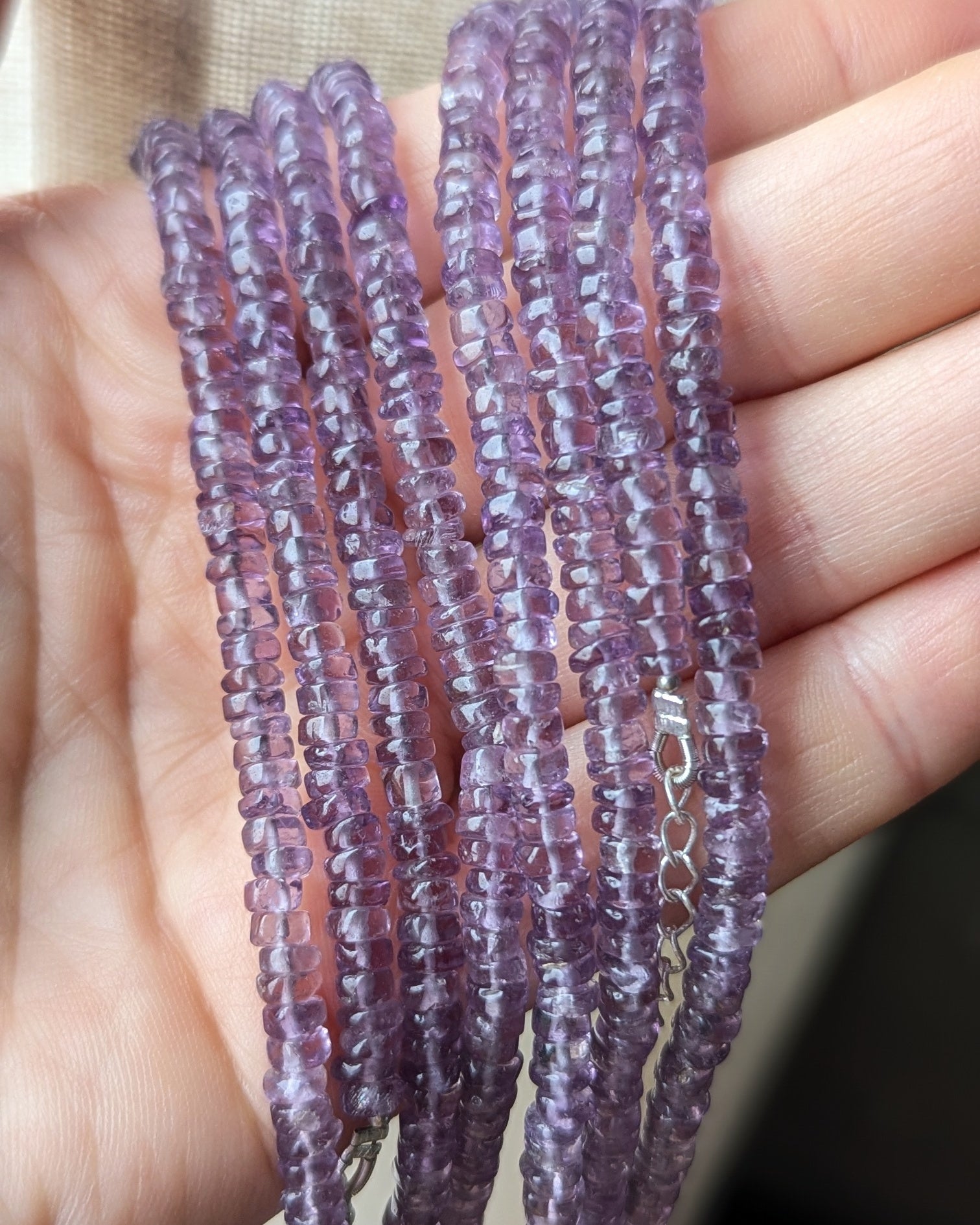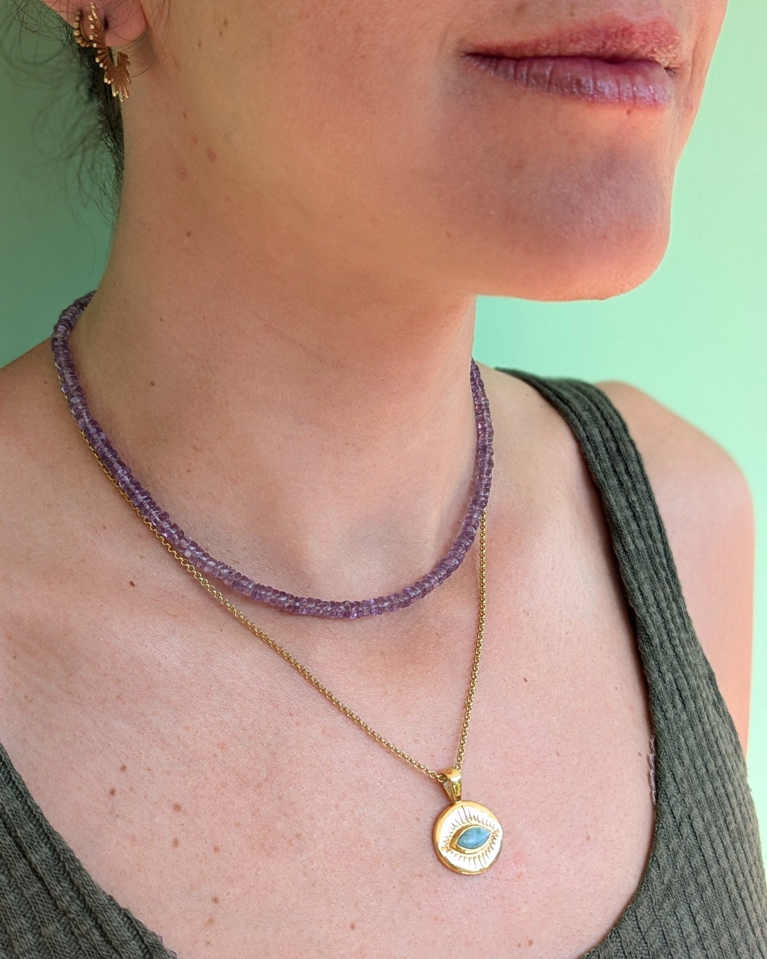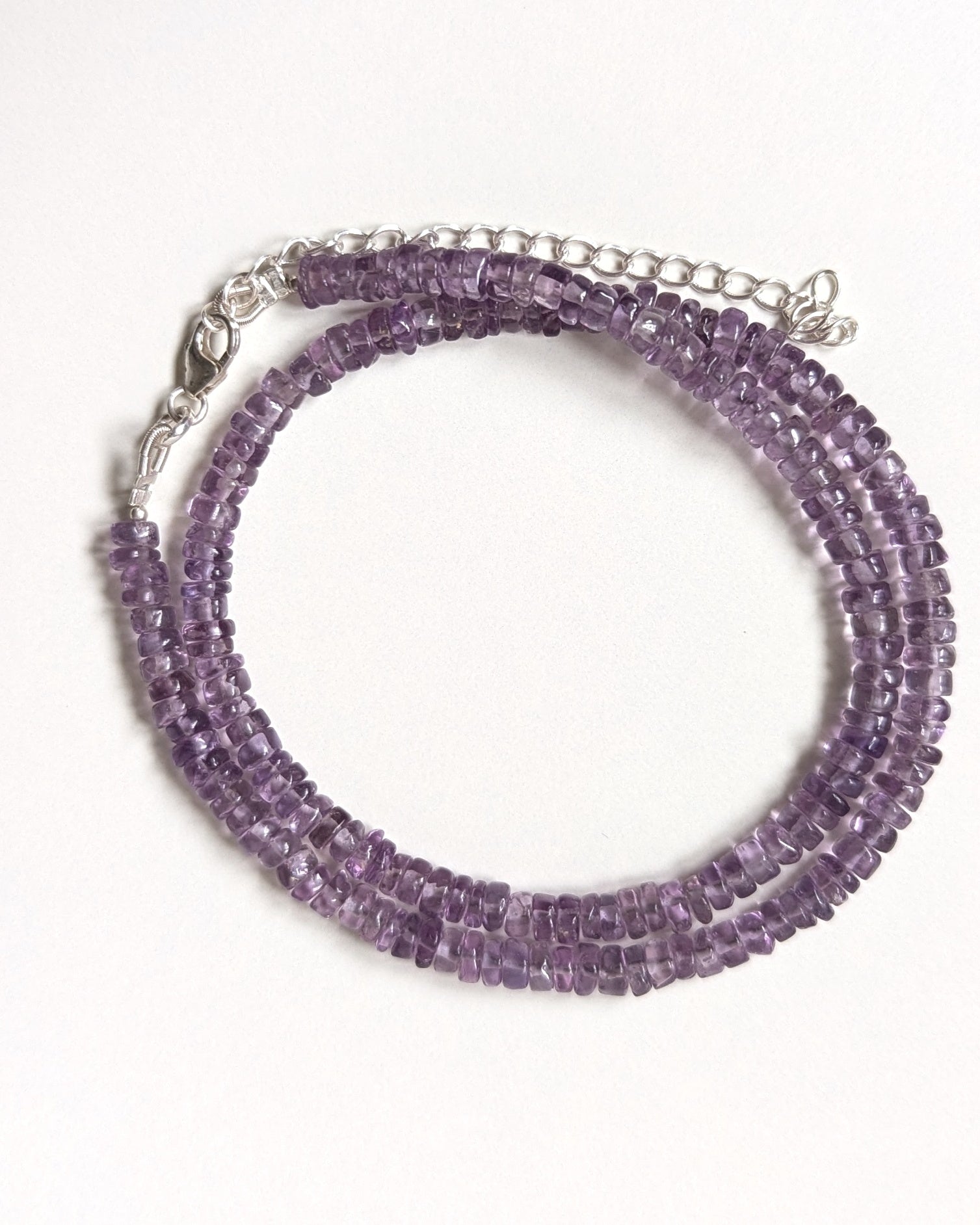 Collanina modello choker realizzata a mano con perline di ametista naturale, simbolo di spiritualità, protezione e intuizione.
