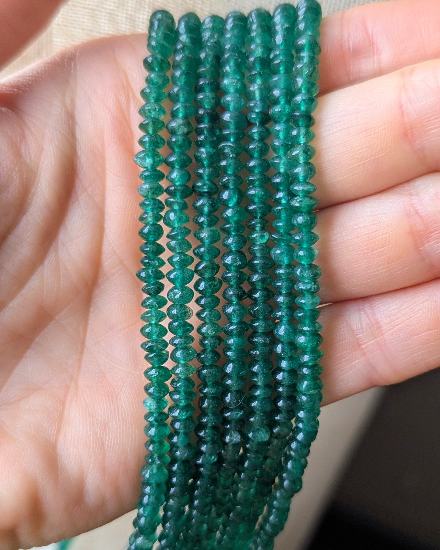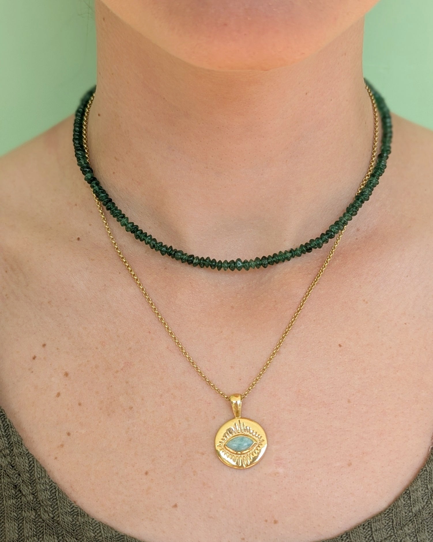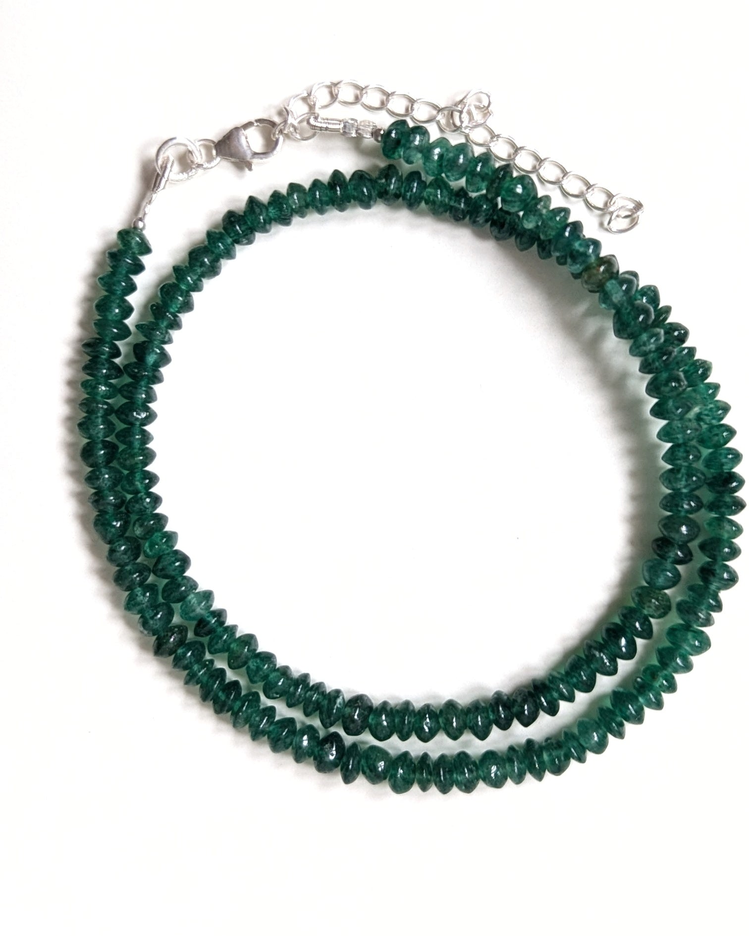 Collanina modello choker realizzata a mano con perline di avventurina verde naturale, simbolo di prosperità, equilibrio e rinascita interiore. Questa pietra, conosciuta per attrarre fortuna e abbondanza, aiuta a sciogliere le tensioni emotive e ad attrarre energie positive, rafforzando il legame con la propria intuizione.