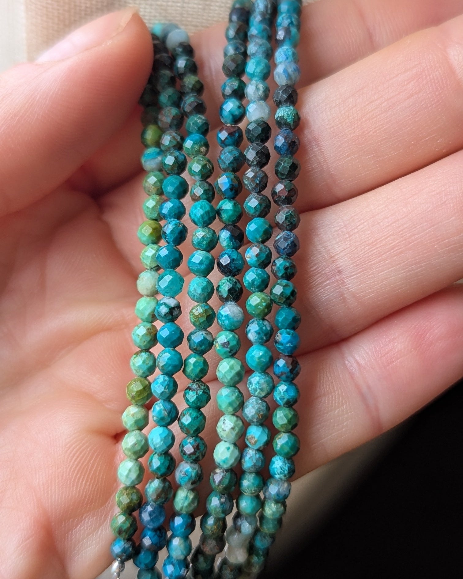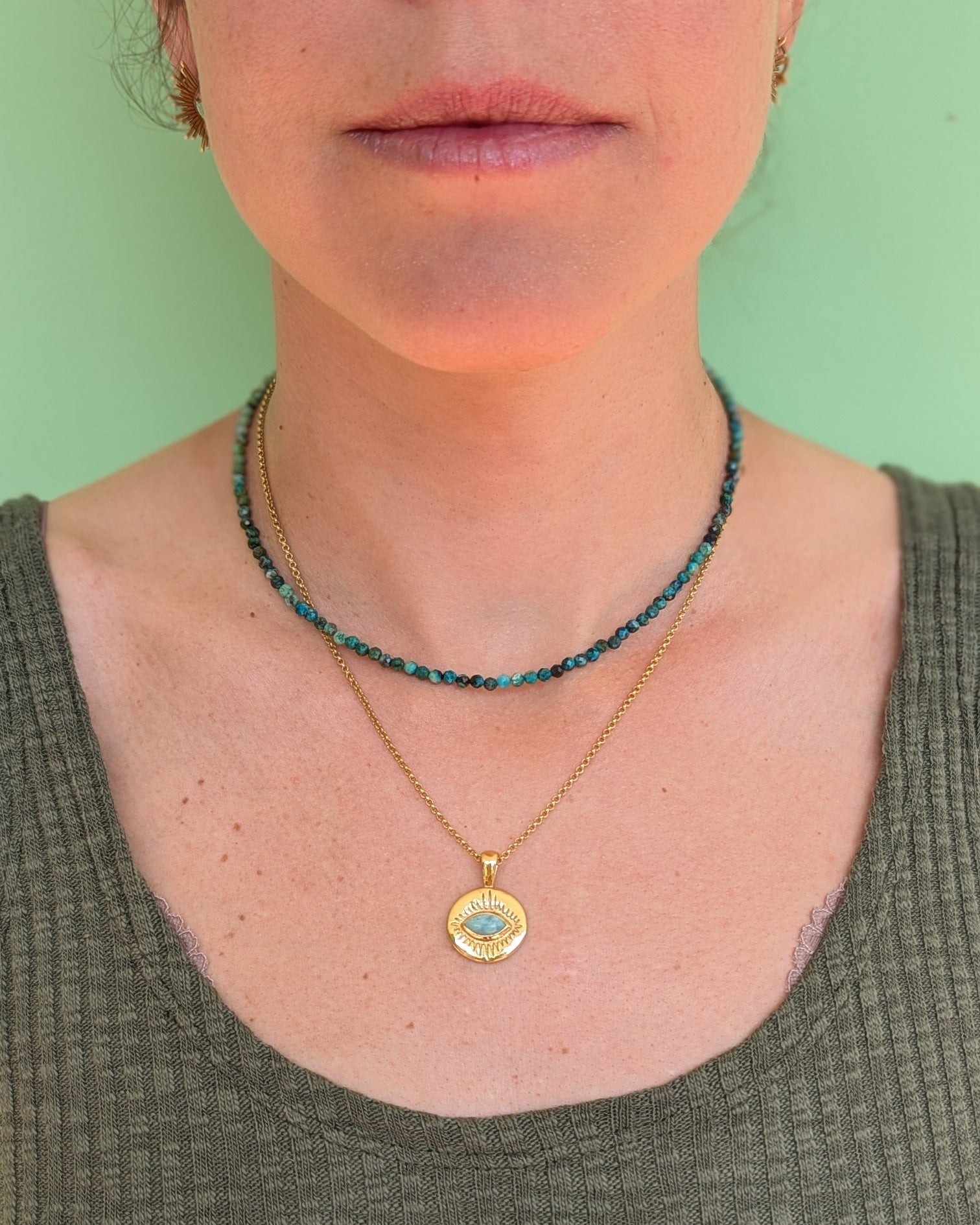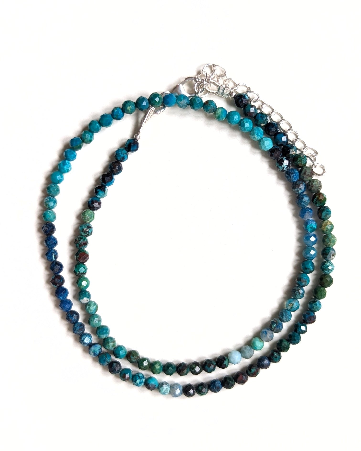 Collanina modello choker realizzata a mano con perline di azzurrite naturale di qualità superiore, simbolo di comprensione, libertà e comunicazione. Questa pietra porta nuove prospettive, espandendo la mente. Libera i blocchi connessi alla comunicazione e stimola la memoria. A livello emotivo, libera da stress e preoccupazione invitando ad esprimersi.