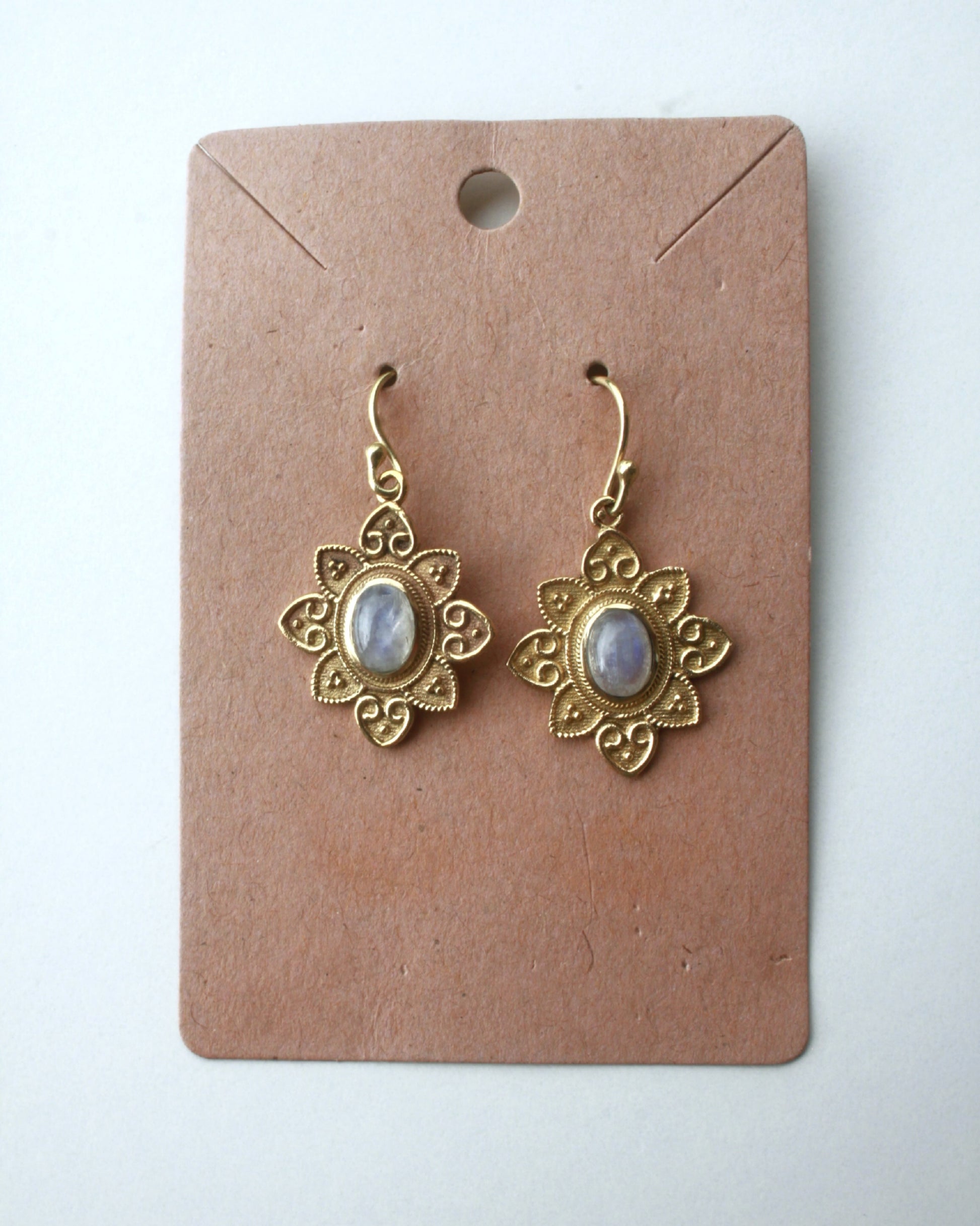 Un fiore con anima etnica e dettagli delicati, accoglie al centro una labradorite bianca, luminosa come la luna nel suo pieno splendore.