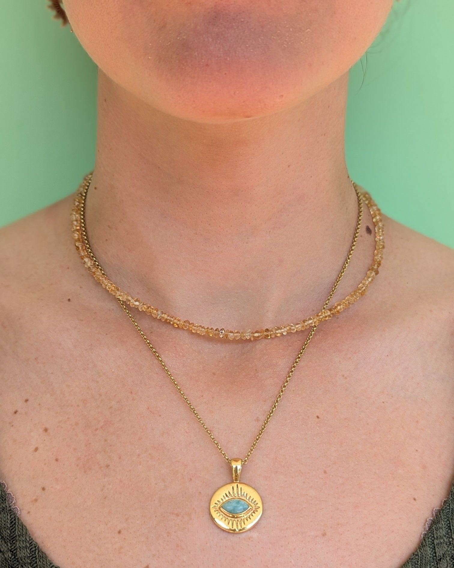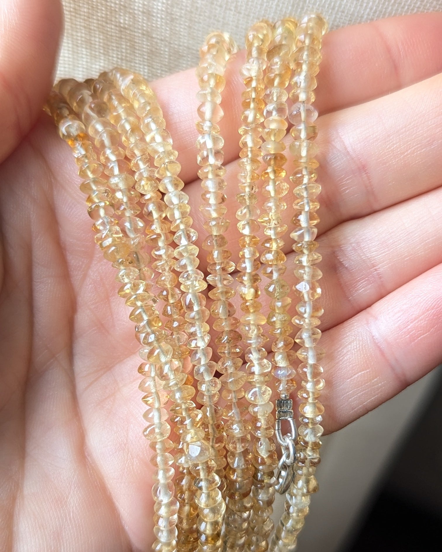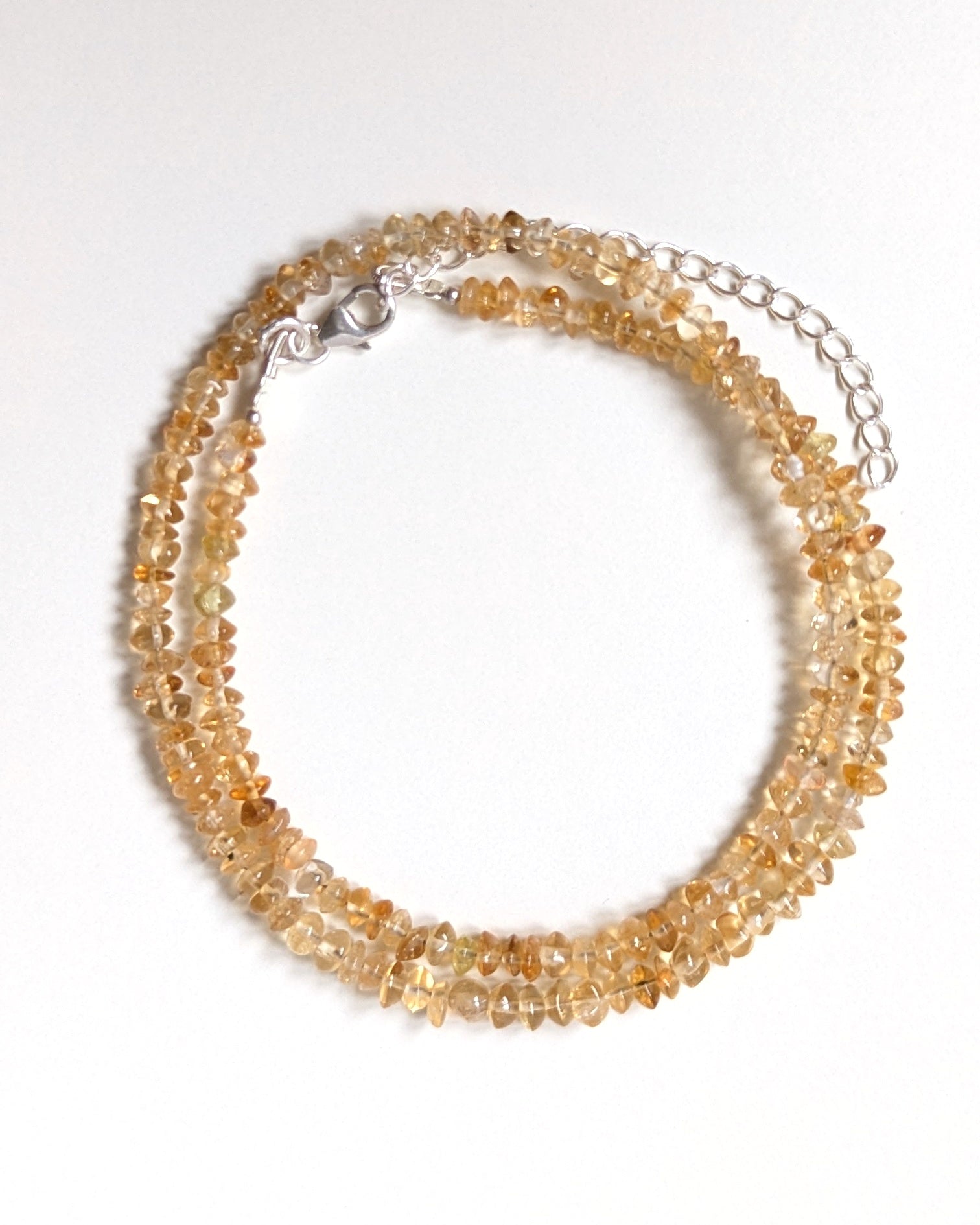 Collanina modello choker realizzata a mano con perline di quarzo citrino naturale, simbolo di rinnovamento e prosperità. Con la sua energia solare e vivace, stimola la creatività, l'ottimismo e la fiducia in se stessi, aiutando a superare le difficoltà e ad attirare abbondanza nella propria vita. È una pietra perfetta per chi cerca positività, successo e una maggiore connessione con la propria luce interiore.